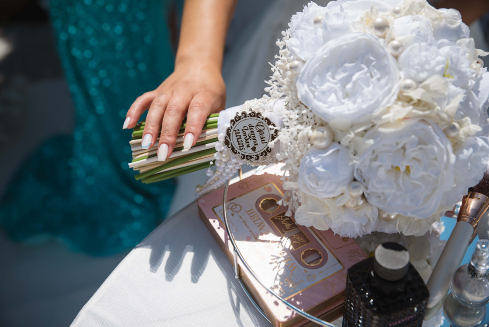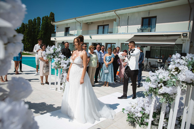 Mireasa a ieșit lângă piscină, într-un decor de poveste, acolo unde îl aștepta cu emoție pe alesul ei. Mirele a sosit cu un buchet spectaculos de flori, iar privirile celor doi au transformat clipa într-un moment de neuitat.